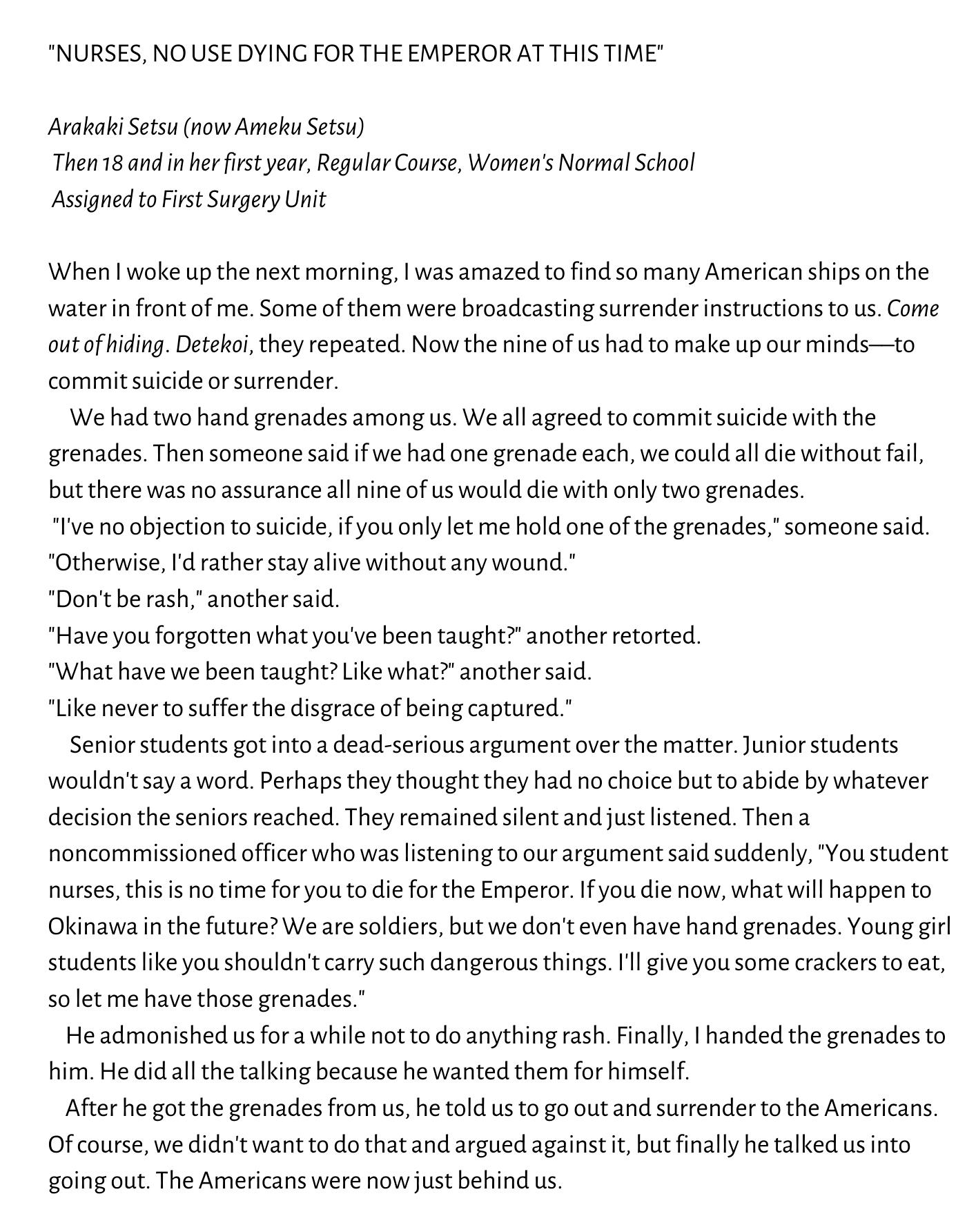 Excerpt taken from "Testimonials from Himeyuri Student Nurses", Mānoa 13:1 (2001), p. 149