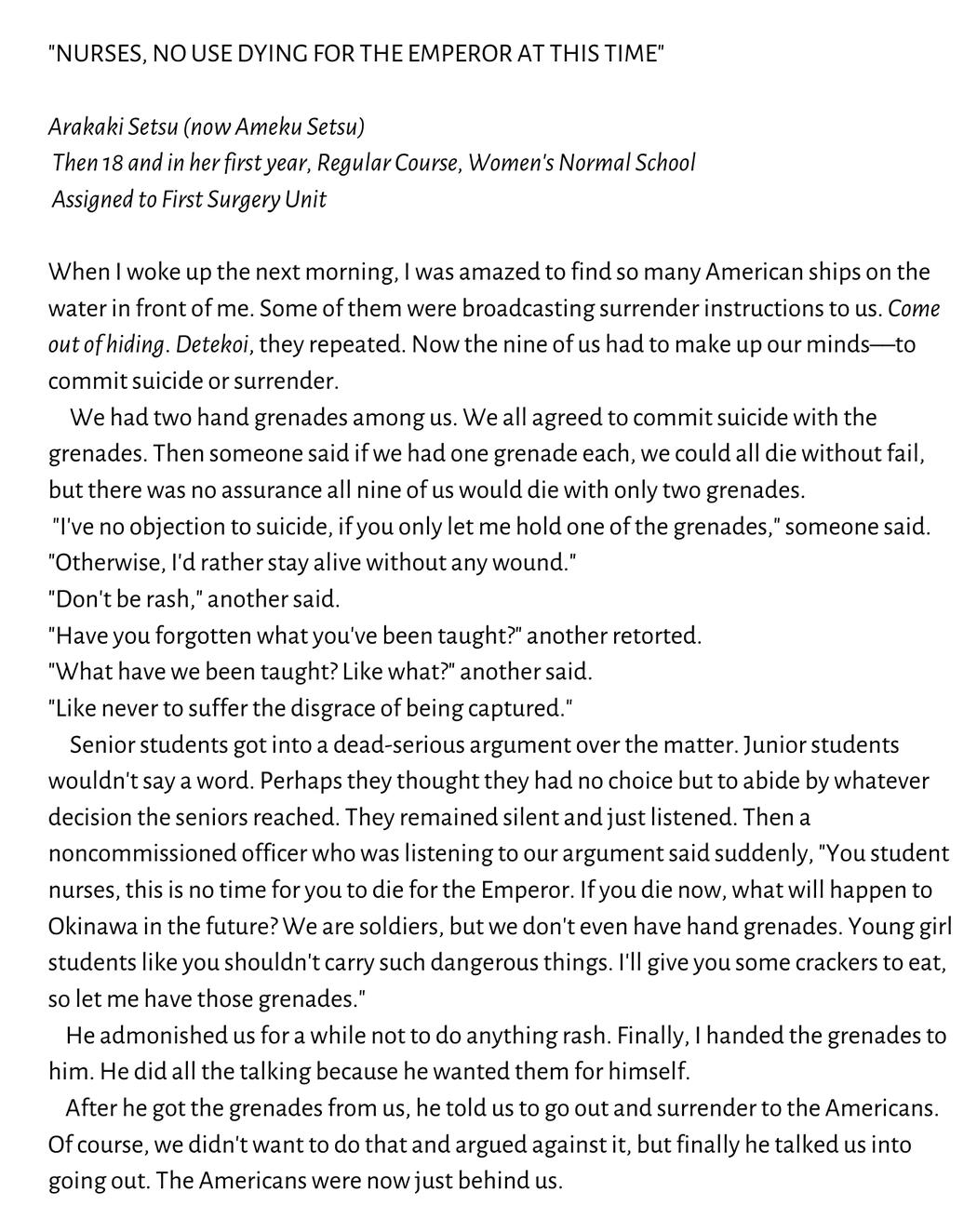 Excerpt taken from "Testimonials from Himeyuri Student Nurses", Mānoa 13:1 (2001), p. 149